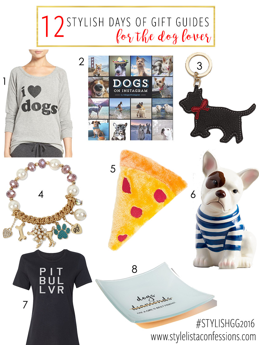 1. Chaser 'I Love Dogs" Pullover Top // 2. Dogs on Instagram Book // 3. Leather Scottie Dog Keychain // 4. Betsey Johnson Poodle Charm Bracelet // 5. Pizza Plus Toy // 6. French Bulldog Cookie Jar // 7. PITBUL LVR T-Shirt // 8. Dogs are a Girl's Best Friend Jewelry Tray